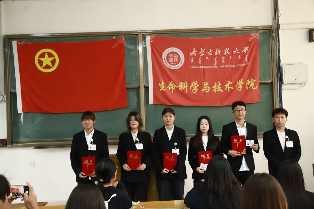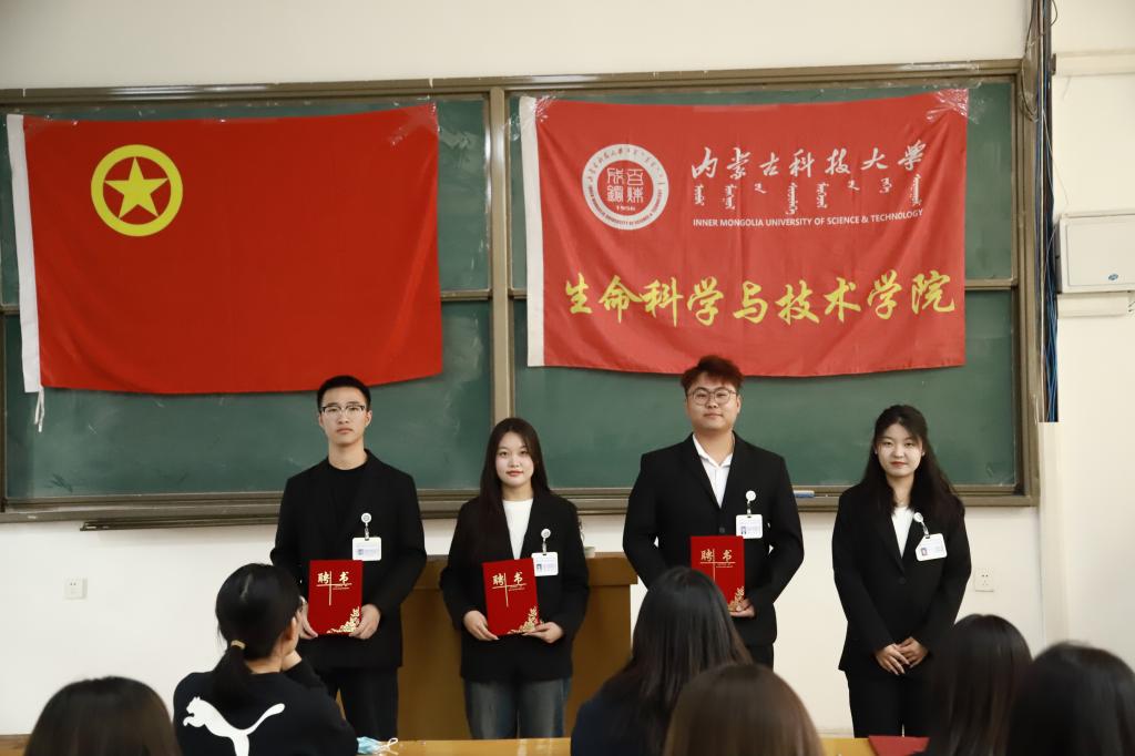 大会第三项:聘任2023届团学组织主席团。(1)乌日根老师宣读2023届团学组织主席团成员名单:主席团主席许双丁同学、团总支副书记孙悦同学、副主席昝梓萌同学、副主席杜志豪同学;(2)张超老师为2023届团学组织主席团成员颁发聘书和工作证,并对2023届团学组织未来一年的工作做出简要期许;(3)2023届主席团成员依次介绍了自己及分管部门,并对任期内所承担工作做出表态与承诺。