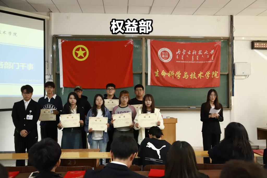 大会第五项:聘任2023届团学组织各部门部长。由主席团成员许双丁同学宣读2023届团学组织各部门部长名单,主席团成员为其所分管部门部长颁发聘书和工作证。