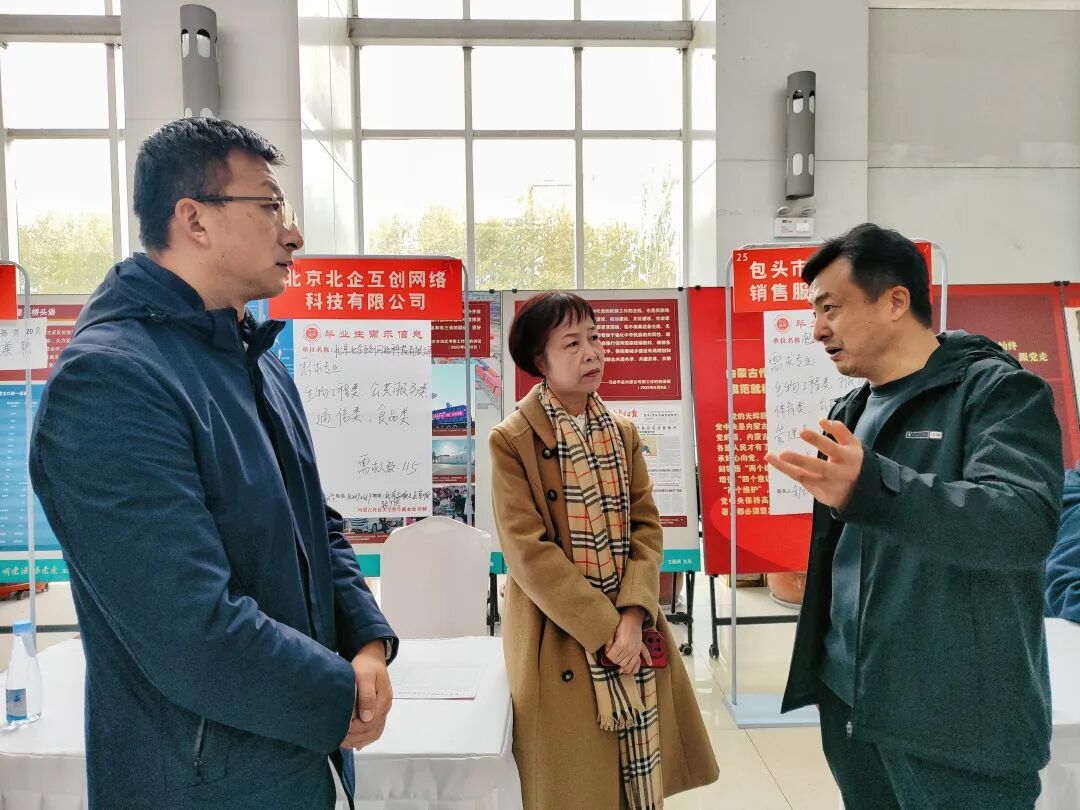 包头市妇联党组成员、副主席李俊现场调研用人单位招聘需求及公司毕业生应聘情况,公司经理杜志强、党委副书记兼副经理王晓东,以及各系主任、班主任、辅导员、研究生导师、毕业论文指导教师等在现场为动员同学们积极投递简历,对同学们进行现场指导,并积极与各用人单位沟通交流。