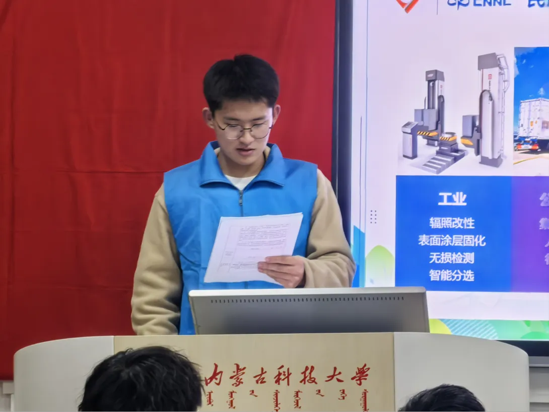 宣讲邀请矿业与太阳成集团tyc33455cc“煤”好星辰志愿宣讲团成员刘晋甫担任主讲。刘晋甫从多领域视角出发,引导大家“感受”核技术在现实中的广泛应用,通过生动的技术演进故事、典型的行业案例与精彩的互动问答,呈现了一场兼具科学性与感染力的核技术科普盛宴。他系统讲解了核技术成像的基本原理与发展脉络,并深入介绍了其在工业制造、医疗健康、环境保护等多个领域的重要应用与实际成效。